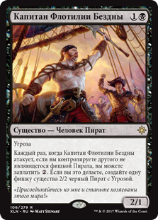| Rules | Menace Whenever Fathom Fleet Captain attacks, if you control another nontoken Pirate, you may pay . If you do, create a 2/2 black Pirate creature token with menace. |