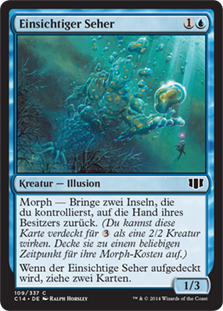 | Rules | Morph—Return two Islands you control to their owner's hand. (You may cast this card face down as a 2/2 creature for . Turn it face up any time for its morph cost.) When Fathom Seer is turned face up, draw two cards. |