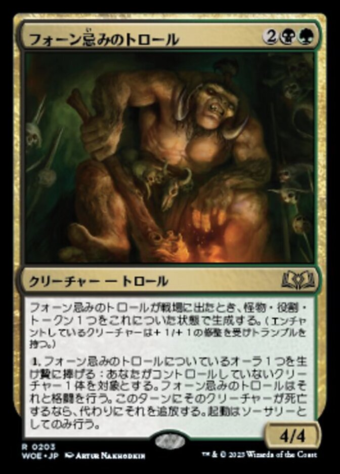 | Rules | When Faunsbane Troll enters the battlefield, create a Monster Role token attached to it. (Enchanted creature gets +1/+1 and has trample.) , Sacrifice an Aura attached to Faunsbane Troll: Faunsbane Troll fights target creature you don't control. If that creature would die this turn, exile it instead. Activate only as a sorcery. |