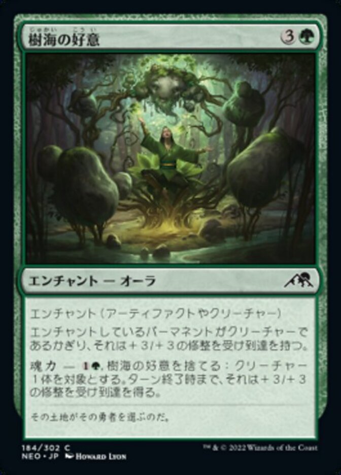 | Rules | Enchant artifact or creature As long as enchanted permanent is a creature, it gets +3/+3 and has reach. Channel — , Discard Favor of Jukai: Target creature gets +3/+3 and gains reach until end of turn. |