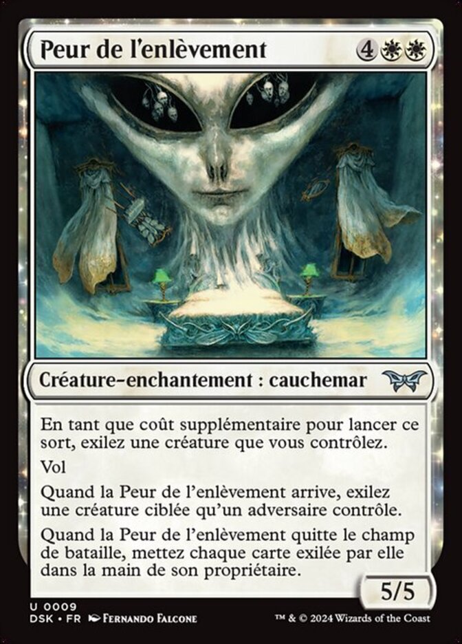 | Rules | As an additional cost to cast this spell, exile a creature you control. Flying When Fear of Abduction enters, exile target creature an opponent controls. When Fear of Abduction leaves the battlefield, put each card exiled with it into its owner's hand. |