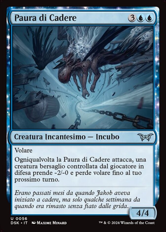 | Rules | Flying Whenever Fear of Falling attacks, target creature defending player controls gets -2/-0 and loses flying until your next turn. |