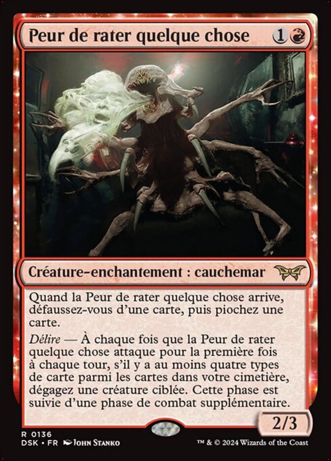 | Rules | When Fear of Missing Out enters, discard a card, then draw a card. Delirium — Whenever Fear of Missing Out attacks for the first time each turn, if there are four or more card types among cards in your graveyard, untap target creature. After this phase, there is an additional combat phase. |