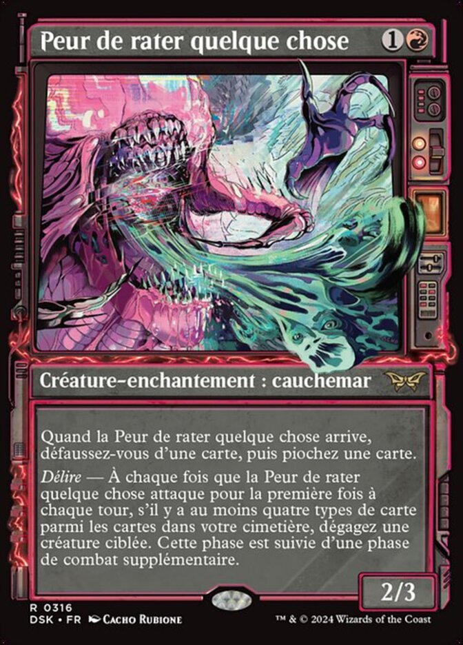 | Rules | When Fear of Missing Out enters, discard a card, then draw a card. Delirium — Whenever Fear of Missing Out attacks for the first time each turn, if there are four or more card types among cards in your graveyard, untap target creature. After this phase, there is an additional combat phase. |