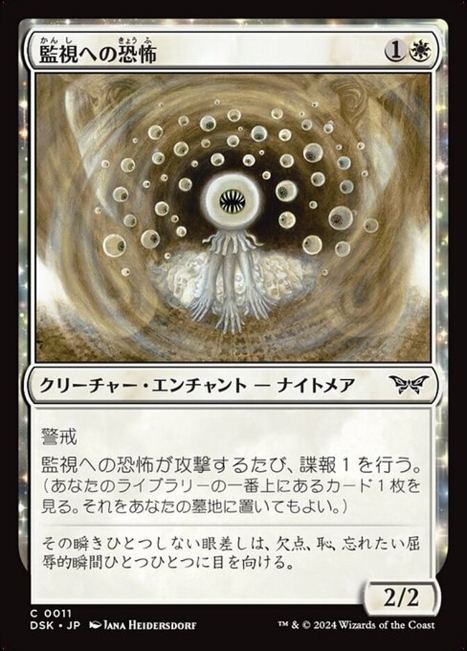 | Rules | Vigilance Whenever Fear of Surveillance attacks, surveil 1. (Look at the top card of your library. You may put it into your graveyard.) |