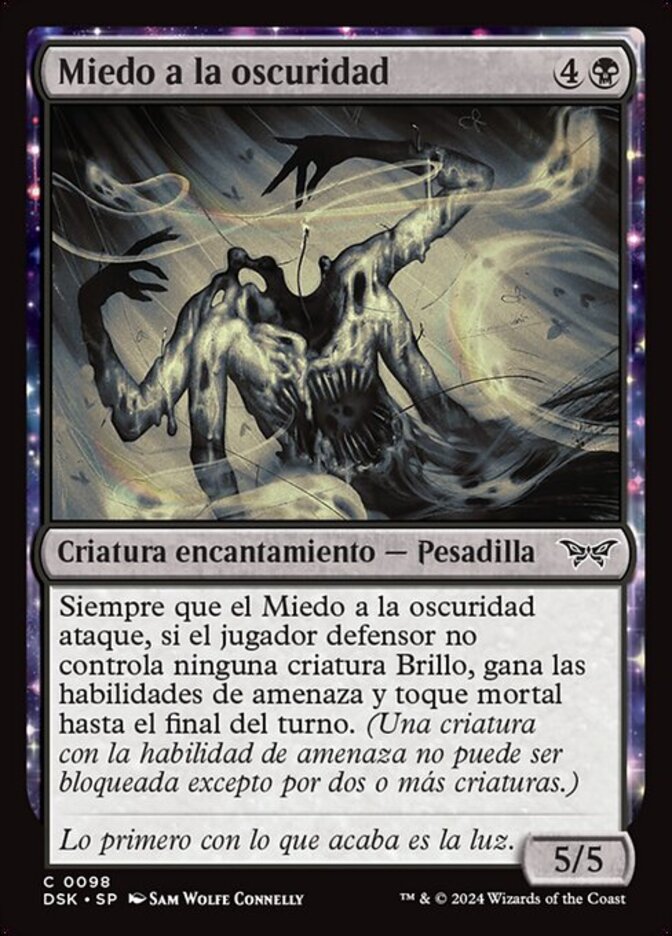 | Rules | Whenever Fear of the Dark attacks, if defending player controls no Glimmer creatures, it gains menace and deathtouch until end of turn. (A creature with menace can't be blocked except by two or more creatures.) |