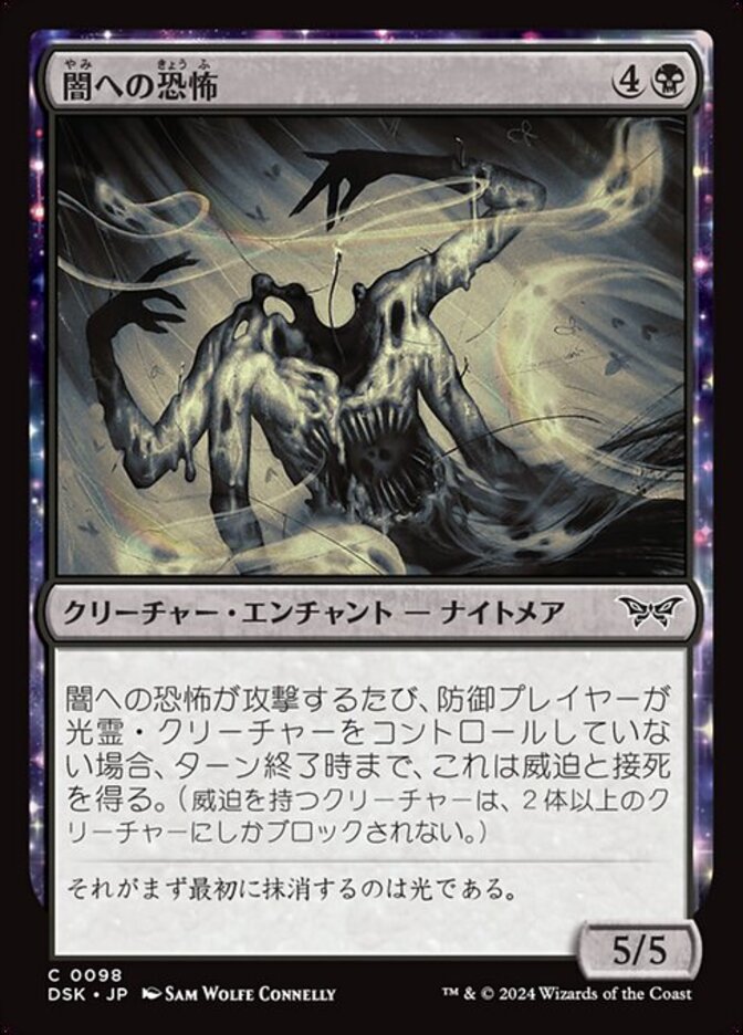 | Rules | Whenever Fear of the Dark attacks, if defending player controls no Glimmer creatures, it gains menace and deathtouch until end of turn. (A creature with menace can't be blocked except by two or more creatures.) |