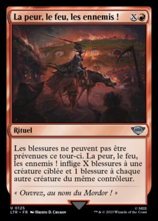 | Rules | Damage can't be prevented this turn. Fear, Fire, Foes! deals X damage to target creature and 1 damage to each other creature with the same controller. |