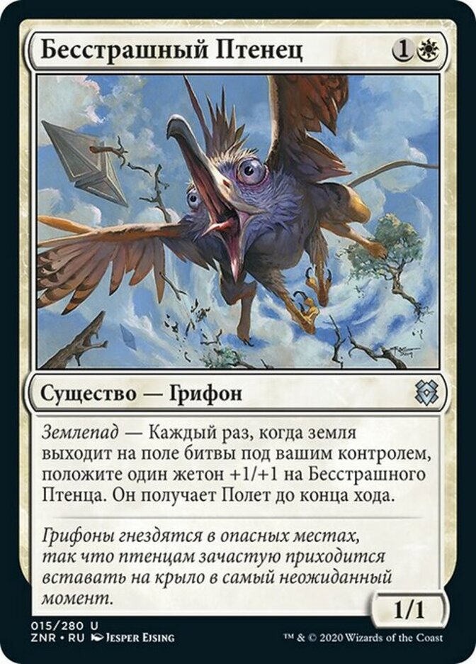 | Rules | Landfall — Whenever a land enters the battlefield under your control, put a +1/+1 counter on Fearless Fledgling. It gains flying until end of turn. |