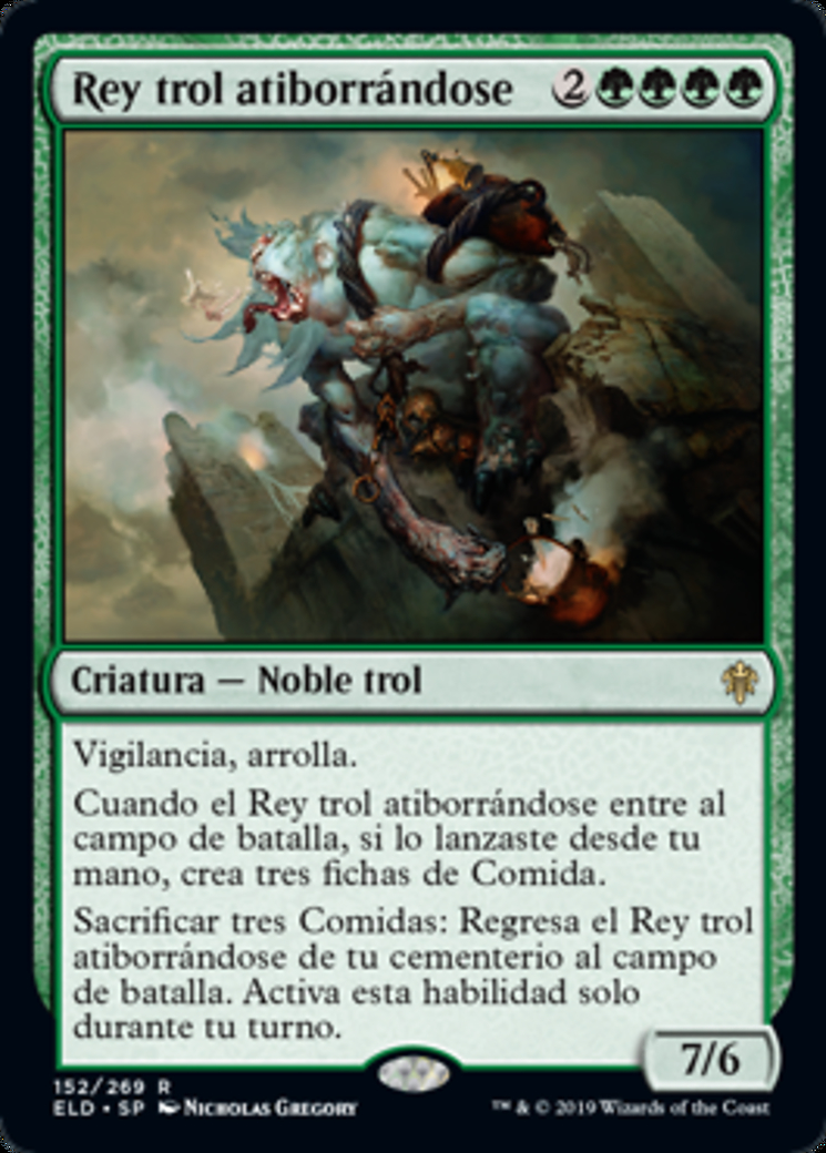 | Rules | Vigilance, trample When Feasting Troll King enters the battlefield, if you cast it from your hand, create three Food tokens. (They're artifacts with ", , Sacrifice this artifact: You gain 3 life.") Sacrifice three Foods: Return Feasting Troll King from your graveyard to the battlefield. Activate only during your turn. |