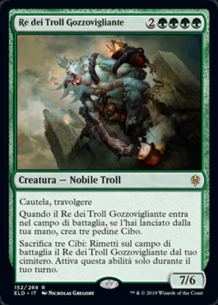 | Rules | Vigilance, trample When Feasting Troll King enters the battlefield, if you cast it from your hand, create three Food tokens. (They're artifacts with ", , Sacrifice this artifact: You gain 3 life.") Sacrifice three Foods: Return Feasting Troll King from your graveyard to the battlefield. Activate only during your turn. |
