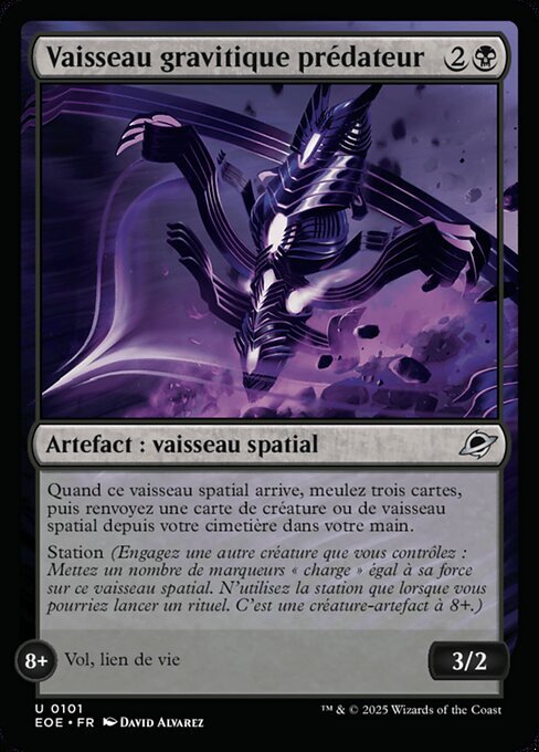 | Rules | When this Spacecraft enters, mill three cards, then return a creature or Spacecraft card from your graveyard to your hand. Station (Tap another creature you control: Put charge counters equal to its power on this Spacecraft. Station only as a sorcery. It's an artifact creature at 8+.) STATION 8+ Flying, lifelink |