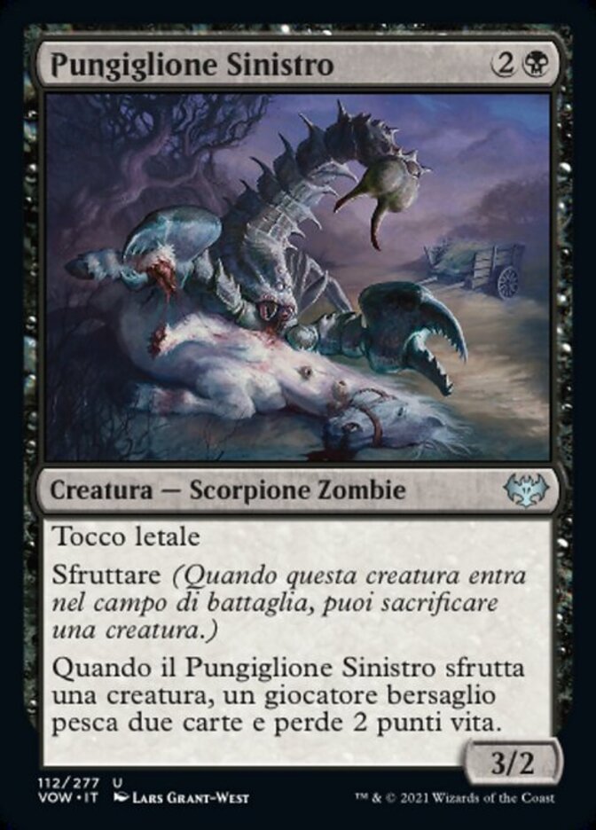 | Rules | Deathtouch Exploit (When this creature enters the battlefield, you may sacrifice a creature.) When Fell Stinger exploits a creature, target player draws two cards and loses 2 life. |