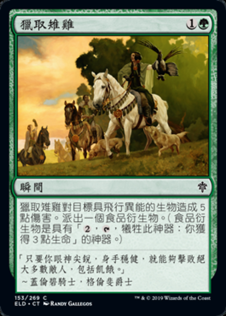 | Rules | Fell the Pheasant deals 5 damage to target creature with flying. Create a Food token. (It's an artifact with ", , Sacrifice this artifact: You gain 3 life.") |