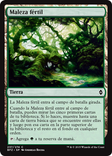 | Rules | Fertile Thicket enters the battlefield tapped. When Fertile Thicket enters the battlefield, you may look at the top five cards of your library. If you do, reveal up to one basic land card from among them, then put that card on top of your library and the rest on the bottom in any order. : Add . |