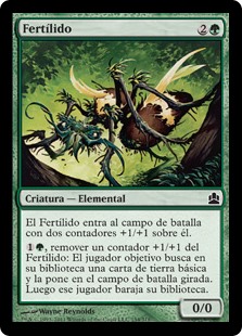 | Rules | Fertilid enters the battlefield with two +1/+1 counters on it. , Remove a +1/+1 counter from Fertilid: Target player searches their library for a basic land card, puts it onto the battlefield tapped, then shuffles. |