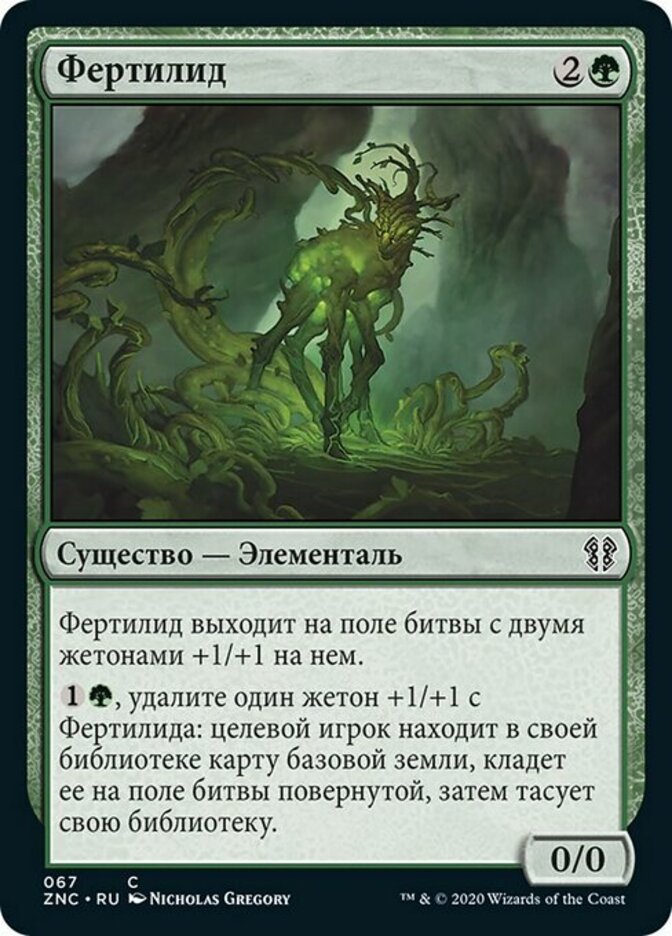 | Rules | Fertilid enters the battlefield with two +1/+1 counters on it. , Remove a +1/+1 counter from Fertilid: Target player searches their library for a basic land card, puts it onto the battlefield tapped, then shuffles. |