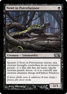 | Rules | When Festering Newt dies, target creature an opponent controls gets -1/-1 until end of turn. That creature gets -4/-4 instead if you control a creature named Bogbrew Witch. |