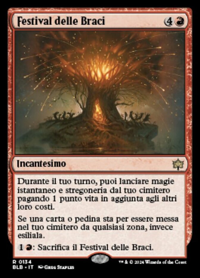 | Rules | During your turn, you may cast instant and sorcery spells from your graveyard by paying 1 life in addition to their other costs. If a card or token would be put into your graveyard from anywhere, exile it instead. : Sacrifice Festival of Embers. |