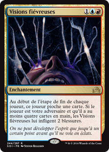 | Rules | At the beginning of each player's end step, that player draws a card. If the player is your opponent and has four or more cards in hand, Fevered Visions deals 2 damage to that player. |