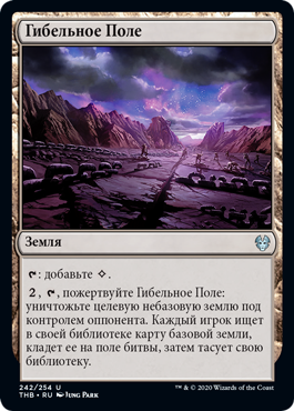 | Rules | : Add . , , Sacrifice Field of Ruin: Destroy target nonbasic land an opponent controls. Each player searches their library for a basic land card, puts it onto the battlefield, then shuffles. |