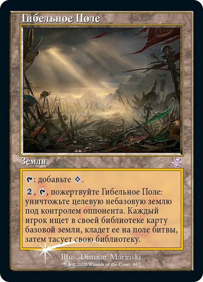 | Rules | : Add . , , Sacrifice Field of Ruin: Destroy target nonbasic land an opponent controls. Each player searches their library for a basic land card, puts it onto the battlefield, then shuffles. |
