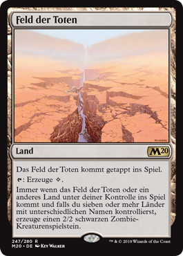 | Rules | Field of the Dead enters the battlefield tapped. : Add . Whenever Field of the Dead or another land enters the battlefield under your control, if you control seven or more lands with different names, create a 2/2 black Zombie creature token. |
