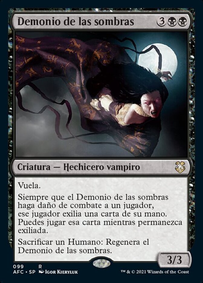 | Rules | Flying Whenever Fiend of the Shadows deals combat damage to a player, that player exiles a card from their hand. You may play that card for as long as it remains exiled. Sacrifice a Human: Regenerate Fiend of the Shadows. |