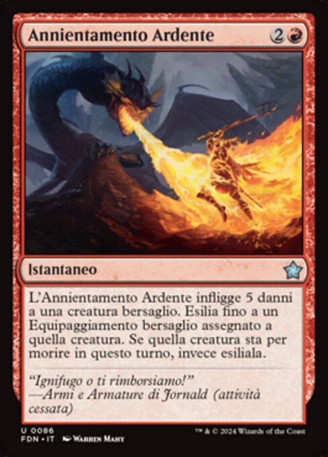 | Rules | Fiery Annihilation deals 5 damage to target creature. Exile up to one target Equipment attached to that creature. If that creature would die this turn, exile it instead. |