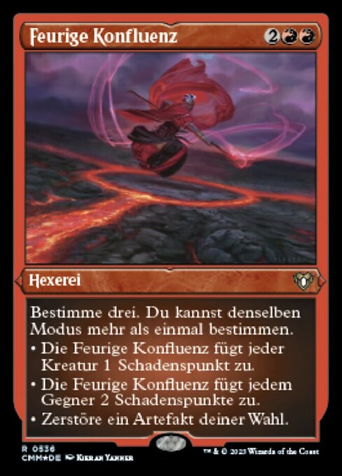 | Rules | Choose three. You may choose the same mode more than once. • Fiery Confluence deals 1 damage to each creature. • Fiery Confluence deals 2 damage to each opponent. • Destroy target artifact. |