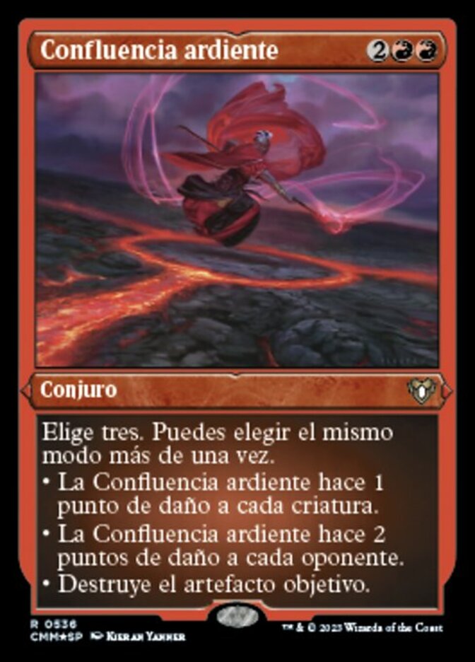 | Rules | Choose three. You may choose the same mode more than once. • Fiery Confluence deals 1 damage to each creature. • Fiery Confluence deals 2 damage to each opponent. • Destroy target artifact. |