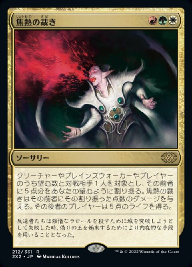 | Rules | Fiery Justice deals 5 damage divided as you choose among any number of targets. Target opponent gains 5 life. |