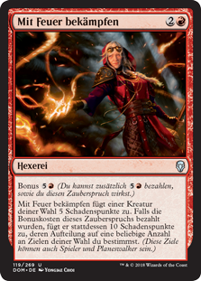 Fight with Fire deals 5 damage to target creature. If this spell was kicked, it deals 10 damage divided as you choose among any number of targets instead. (Those targets can include players and planeswalkers.)