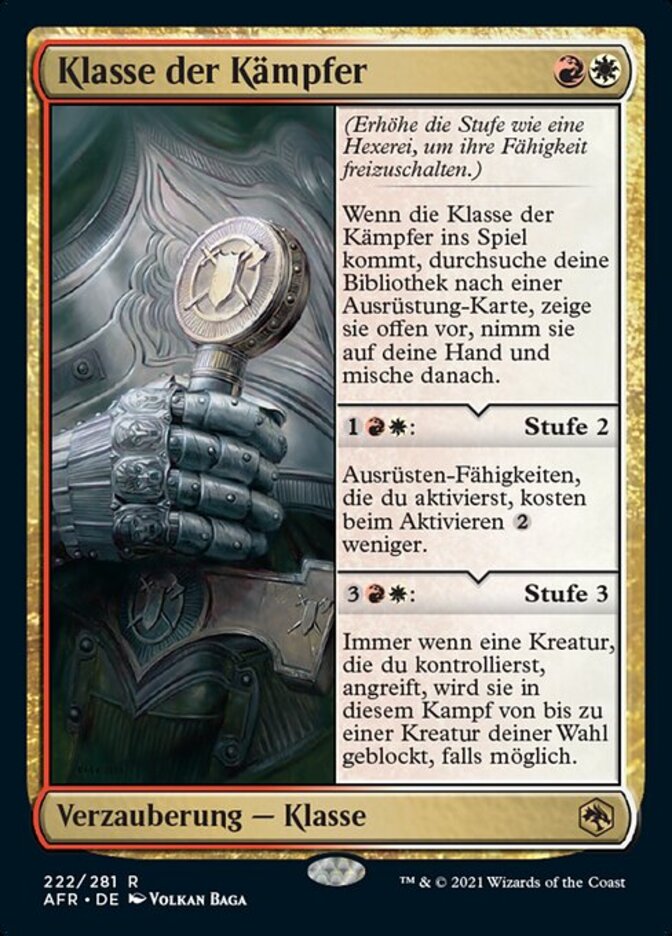 | Rules | (Gain the next level as a sorcery to add its ability.) When Fighter Class enters the battlefield, search your library for an Equipment card, reveal it, put it into your hand, then shuffle. : Level 2 Equip abilities you activate cost less to activate. : Level 3 Whenever a creature you control attacks, up to one target creature blocks it this combat if able. |