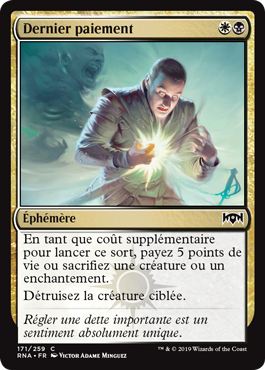 | Rules | As an additional cost to cast this spell, pay 5 life or sacrifice a creature or enchantment. Destroy target creature. |