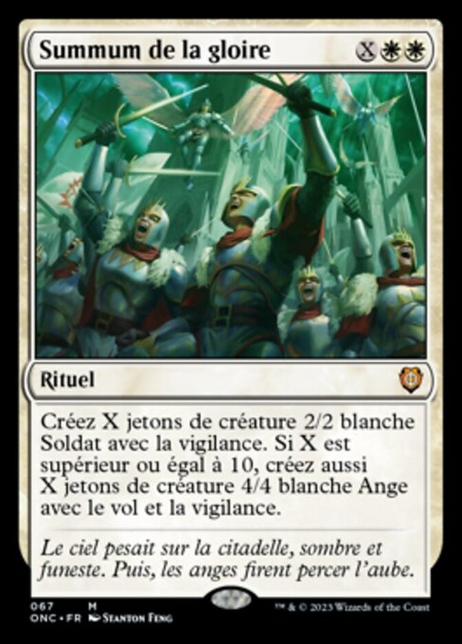 | Rules | Create X 2/2 white Soldier creature tokens with vigilance. If X is 10 or more, also create X 4/4 white Angel creature tokens with flying and vigilance. |