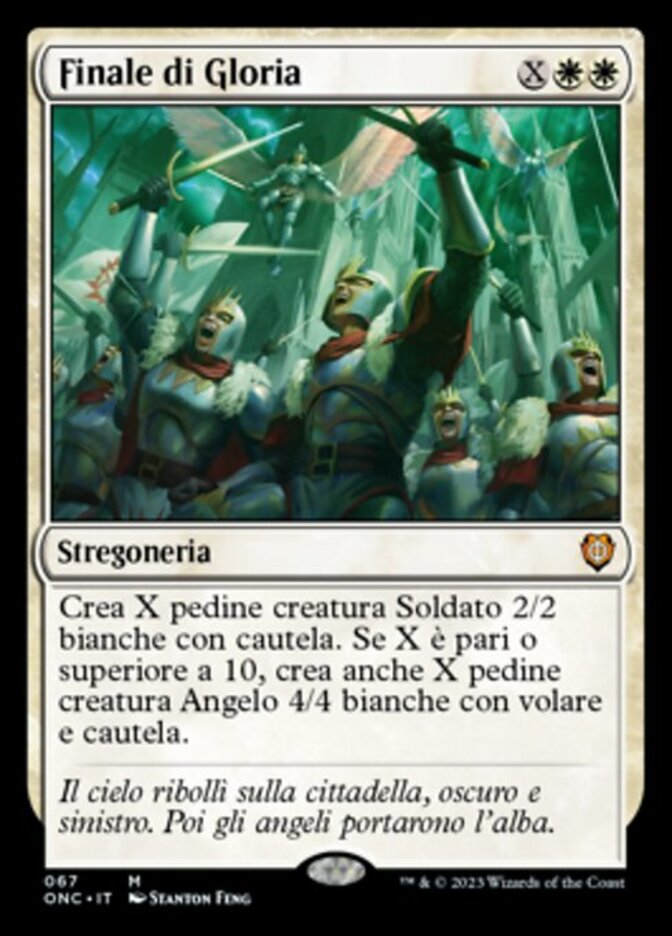 | Rules | Create X 2/2 white Soldier creature tokens with vigilance. If X is 10 or more, also create X 4/4 white Angel creature tokens with flying and vigilance. |