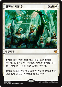 | Rules | Create X 2/2 white Soldier creature tokens with vigilance. If X is 10 or more, also create X 4/4 white Angel creature tokens with flying and vigilance. |