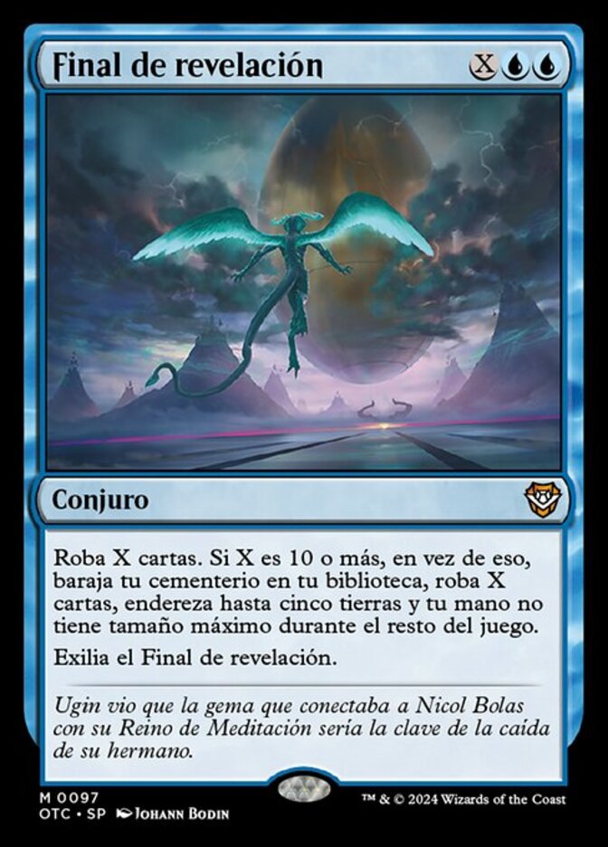 | Rules | Draw X cards. If X is 10 or more, instead shuffle your graveyard into your library, draw X cards, untap up to five lands, and you have no maximum hand size for the rest of the game. Exile Finale of Revelation. |