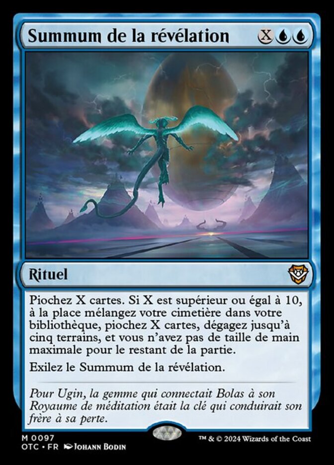 | Rules | Draw X cards. If X is 10 or more, instead shuffle your graveyard into your library, draw X cards, untap up to five lands, and you have no maximum hand size for the rest of the game. Exile Finale of Revelation. |
