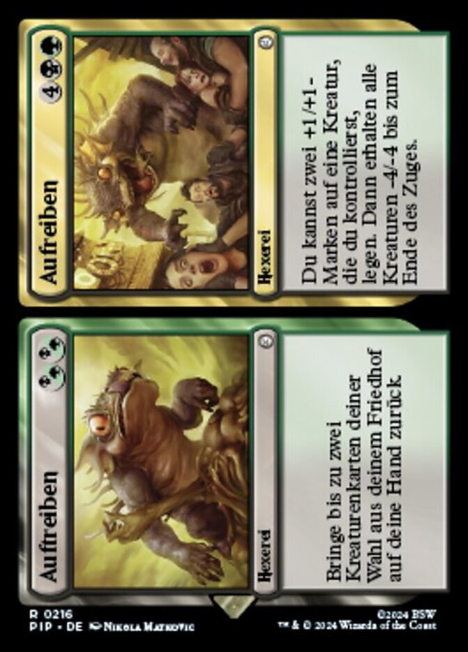 | Rules | Return up to two target creature cards from your graveyard to your hand. // You may put two +1/+1 counters on a creature you control. Then all creatures get -4/-4 until end of turn. |