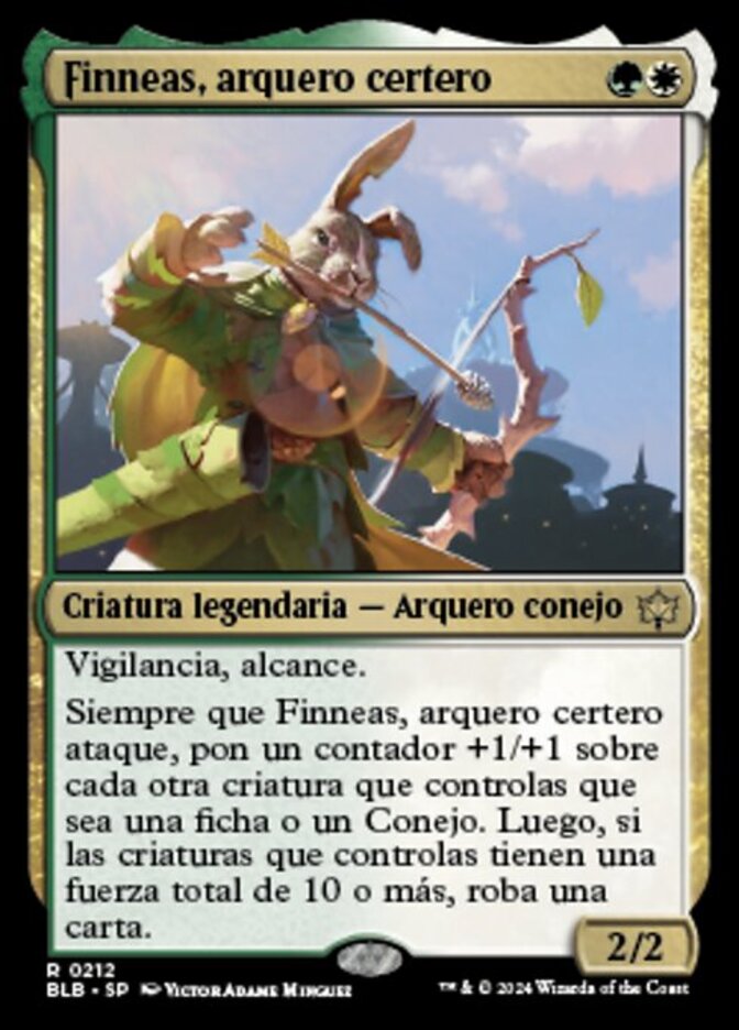 | Rules | Vigilance, reach Whenever Finneas, Ace Archer attacks, put a +1/+1 counter on each other creature you control that's a token or a Rabbit. Then if creatures you control have total power 10 or greater, draw a card. |