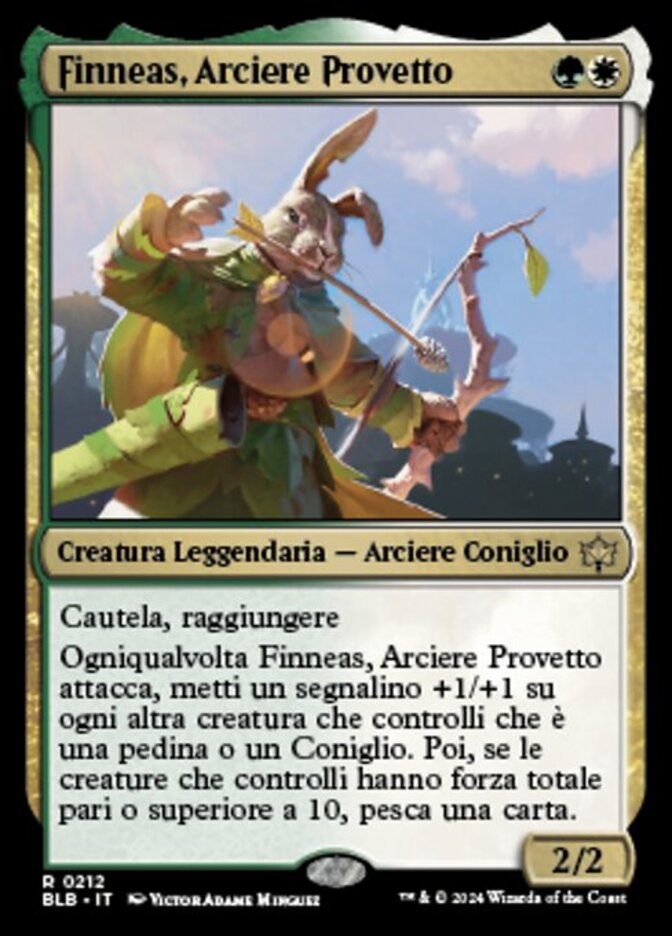 | Rules | Vigilance, reach Whenever Finneas, Ace Archer attacks, put a +1/+1 counter on each other creature you control that's a token or a Rabbit. Then if creatures you control have total power 10 or greater, draw a card. |