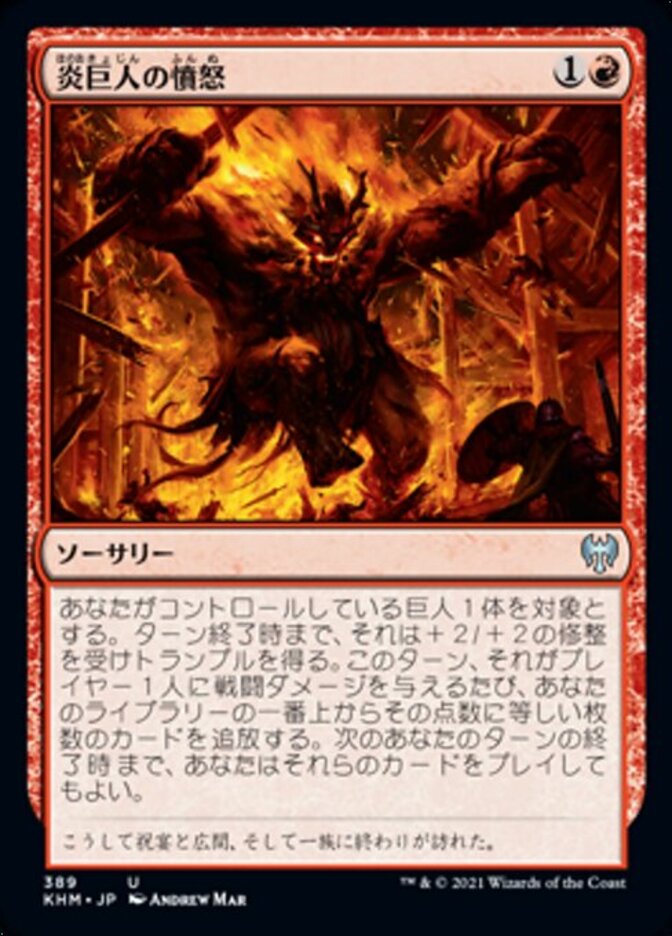 | Rules | Target Giant you control gets +2/+2 and gains trample until end of turn. Whenever it deals combat damage to a player this turn, exile that many cards from the top of your library. Until the end of your next turn, you may play those cards. |
