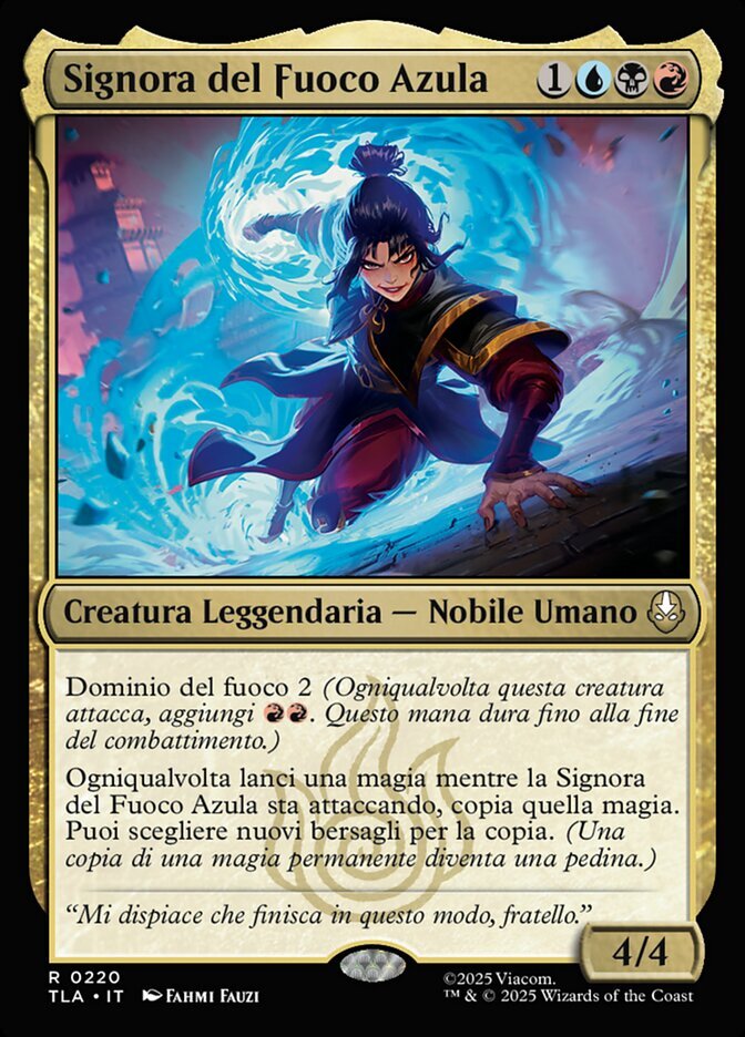| Rules | Firebending 2 (Whenever this creature attacks, add . This mana lasts until end of combat.) Whenever you cast a spell while Fire Lord Azula is attacking, copy that spell. You may choose new targets for the copy. (A copy of a permanent spell becomes a token.) |