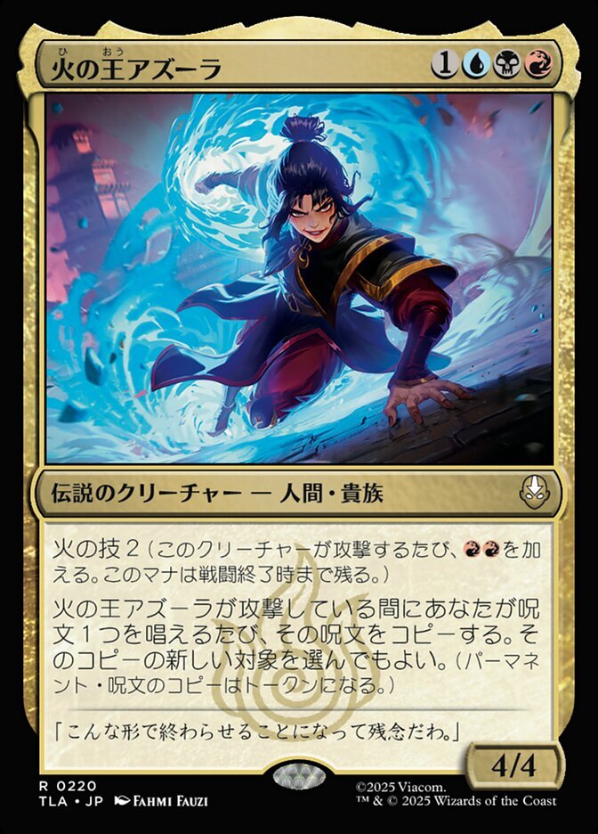 | Rules | Firebending 2 (Whenever this creature attacks, add . This mana lasts until end of combat.) Whenever you cast a spell while Fire Lord Azula is attacking, copy that spell. You may choose new targets for the copy. (A copy of a permanent spell becomes a token.) |