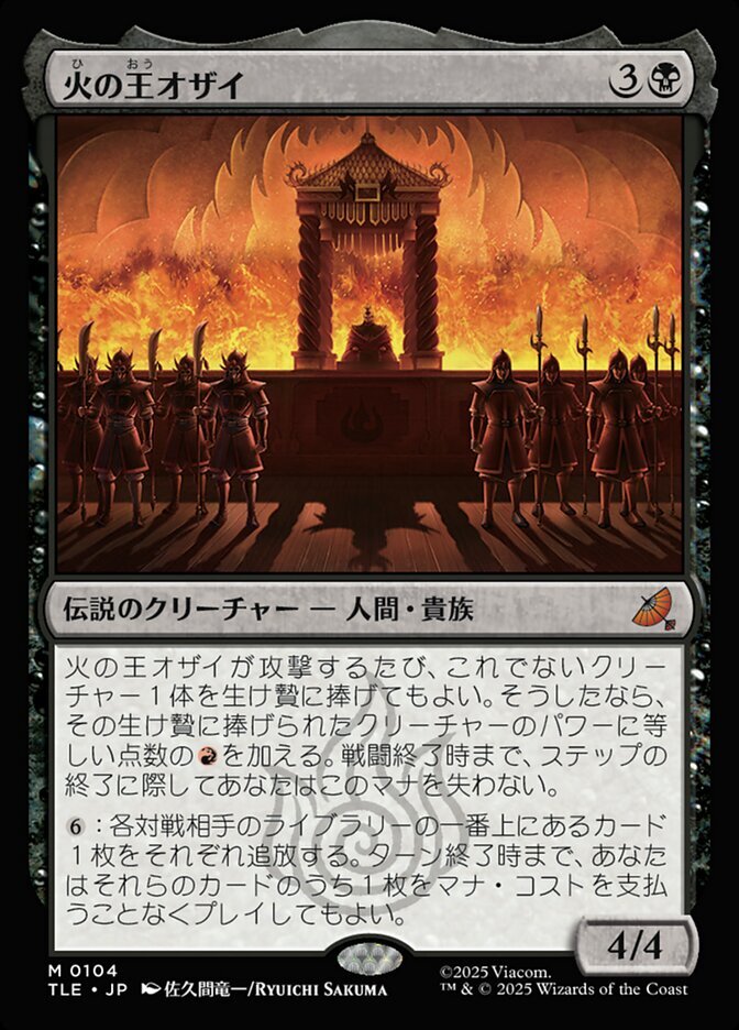 | Rules | Whenever Fire Lord Ozai attacks, you may sacrifice another creature. If you do, add an amount of equal to the sacrificed creature's power. Until end of combat, you don't lose this mana as steps end. : Exile the top card of each opponent's library. Until end of turn, you may play one of those cards without paying its mana cost. |