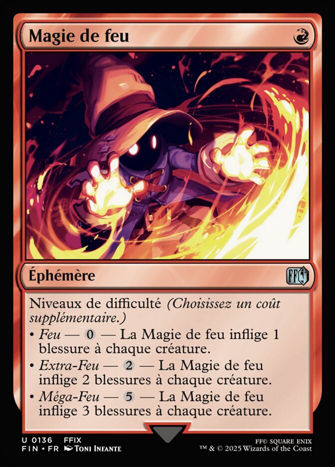 | Rules | Tiered (Choose one additional cost.) • Fire — — Fire Magic deals 1 damage to each creature. • Fira — — Fire Magic deals 2 damage to each creature. • Firaga — — Fire Magic deals 3 damage to each creature. |