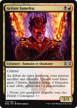 | Rules | Haste At the beginning of your upkeep, you may sacrifice a creature. When you do, Fireblade Artist deals 2 damage to target opponent or planeswalker. |