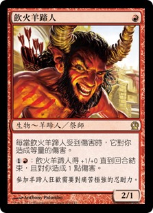 | Rules | Whenever Firedrinker Satyr is dealt damage, it deals that much damage to you. : Firedrinker Satyr gets +1/+0 until end of turn and deals 1 damage to you. |